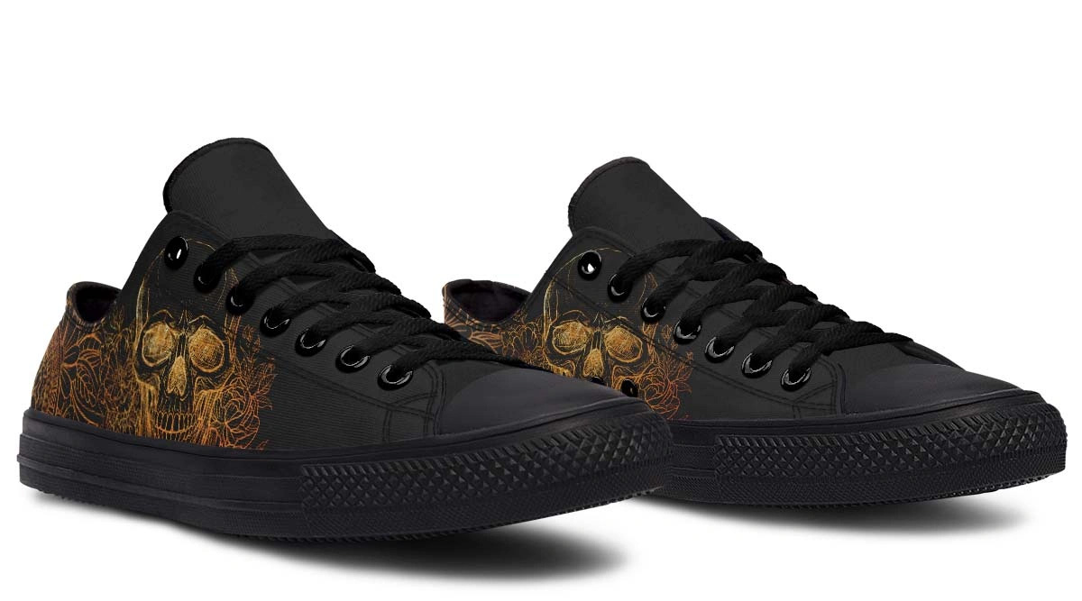 Experience the perfect blend of luxury and minimalism with our Gold Foil Skull Pattern (No Label Print) Black Lowtop Sneakers. These unbranded shoes offer a sleek, clean aesthetic, allowing the vibrant gold foil skull design to take center stage without distracting logos. Built for the fashion-forward individual, they feature a lightweight construction and comfortable insoles suitable for all-day wear. Whether paired with jeans or joggers, these minimalist skull sneakers provide a sophisticated yet edgy look for any modern streetwear wardrobe.