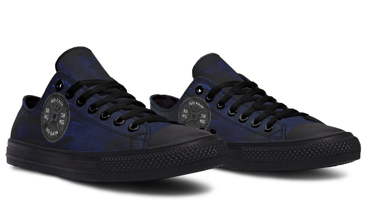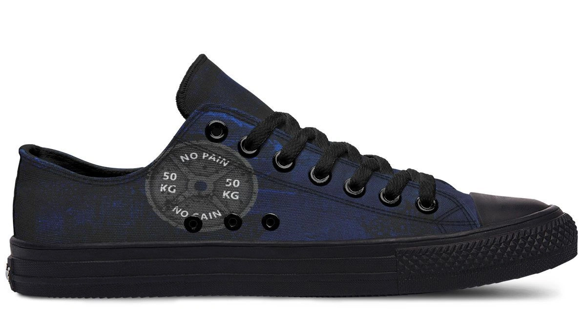 Crushing goals? The No Pain No Gain Blue Pattern Black Low-Top Sneakers combine motivational fitness vibes with sleek athletic style. Get yours today!